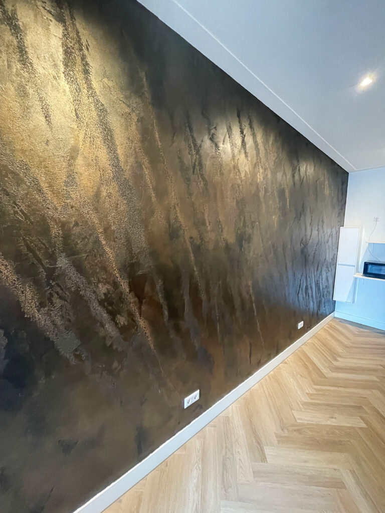 De wanden worden zorgvuldig geschuurd en geprimed met een speciale basislaag die het unieke lichtspel van Dynastie Luna mogelijk maakt.